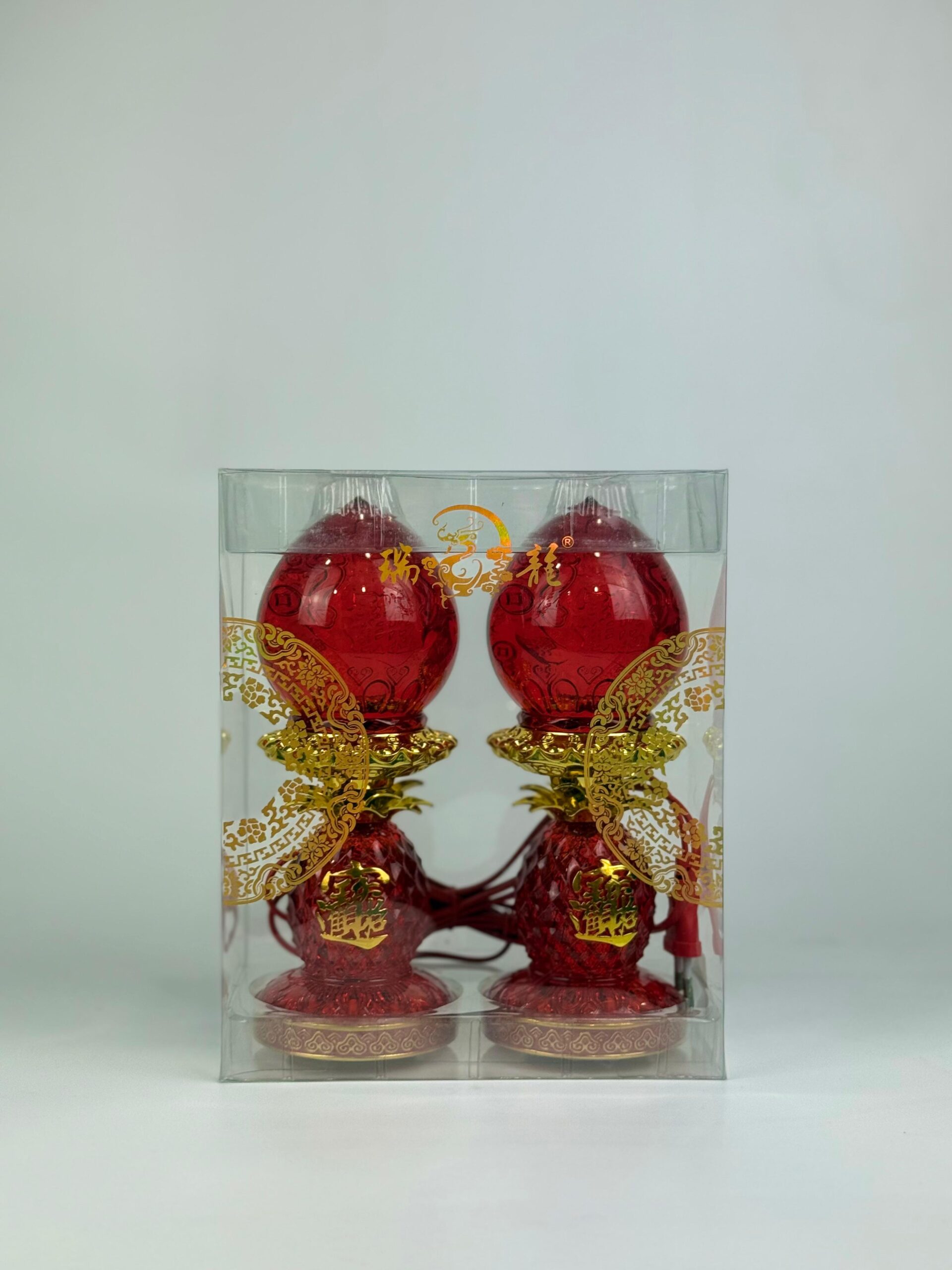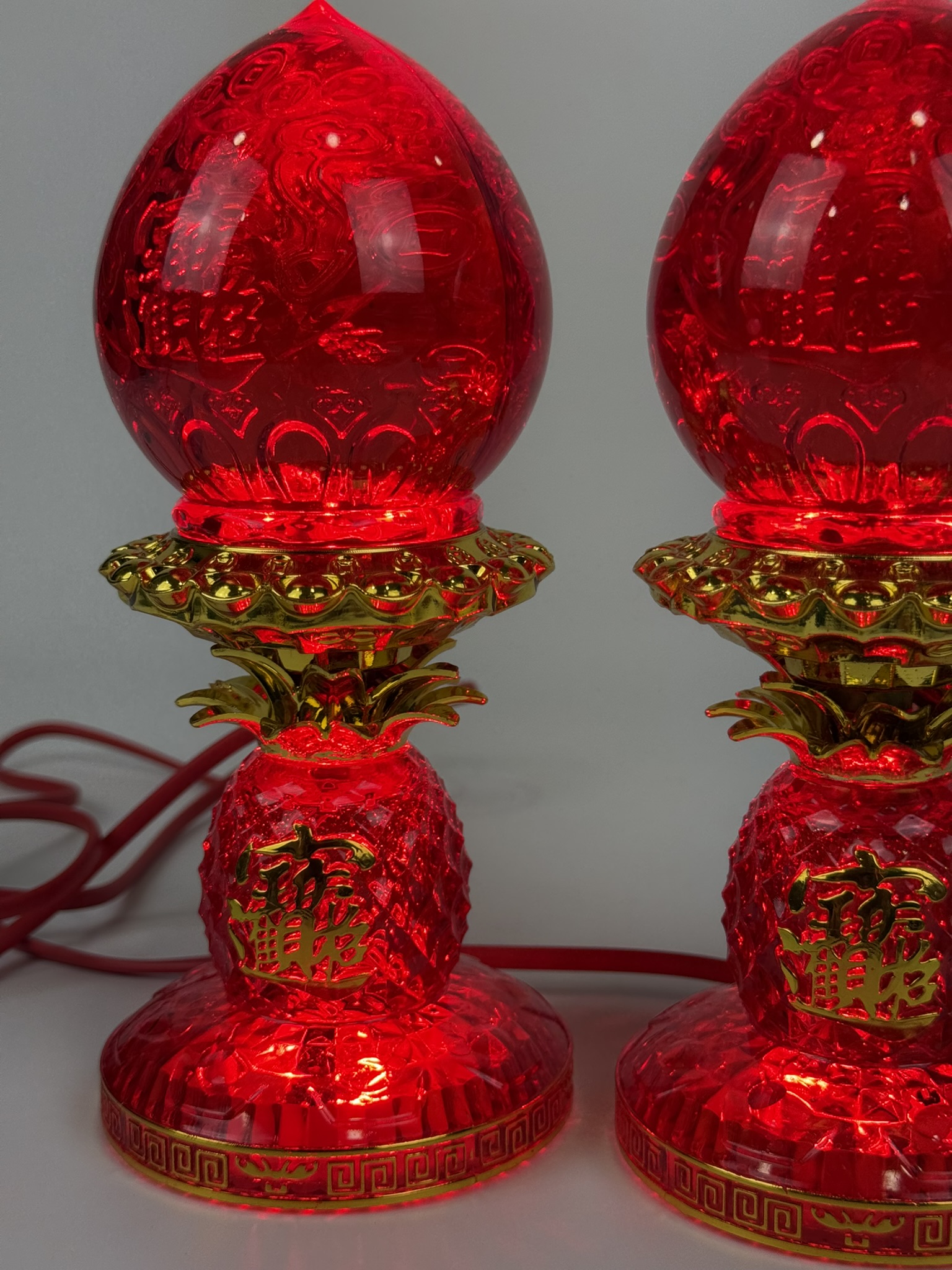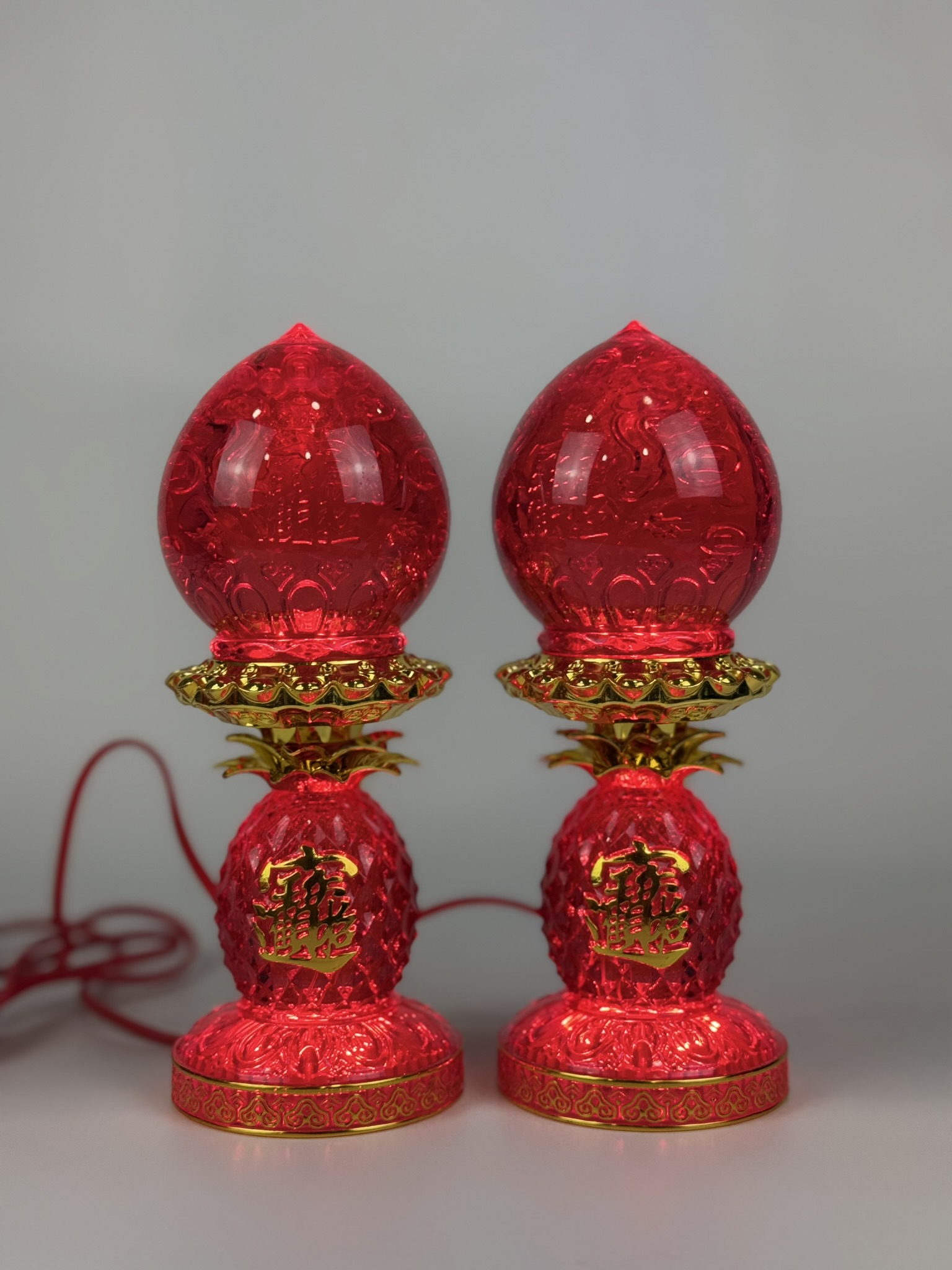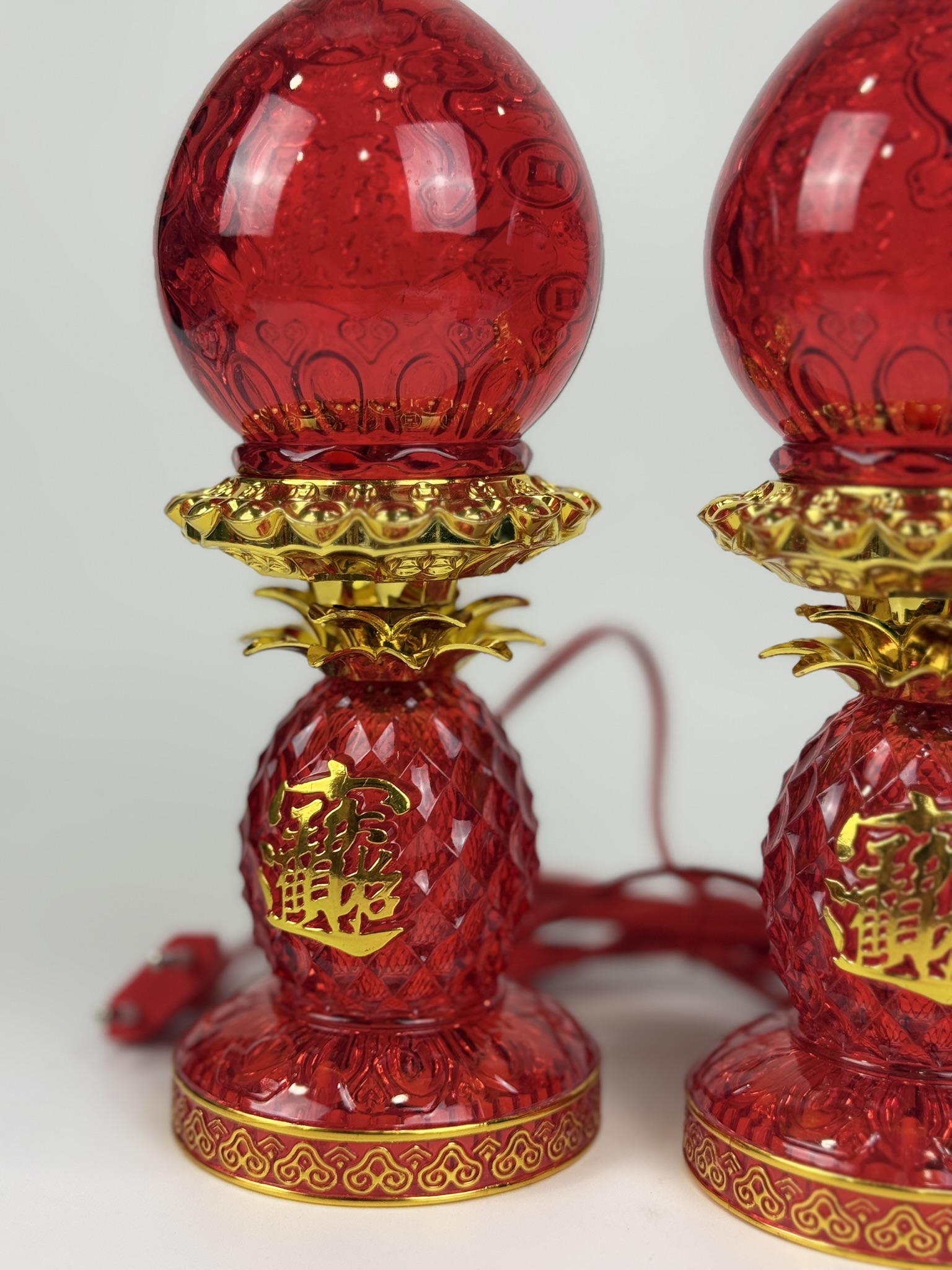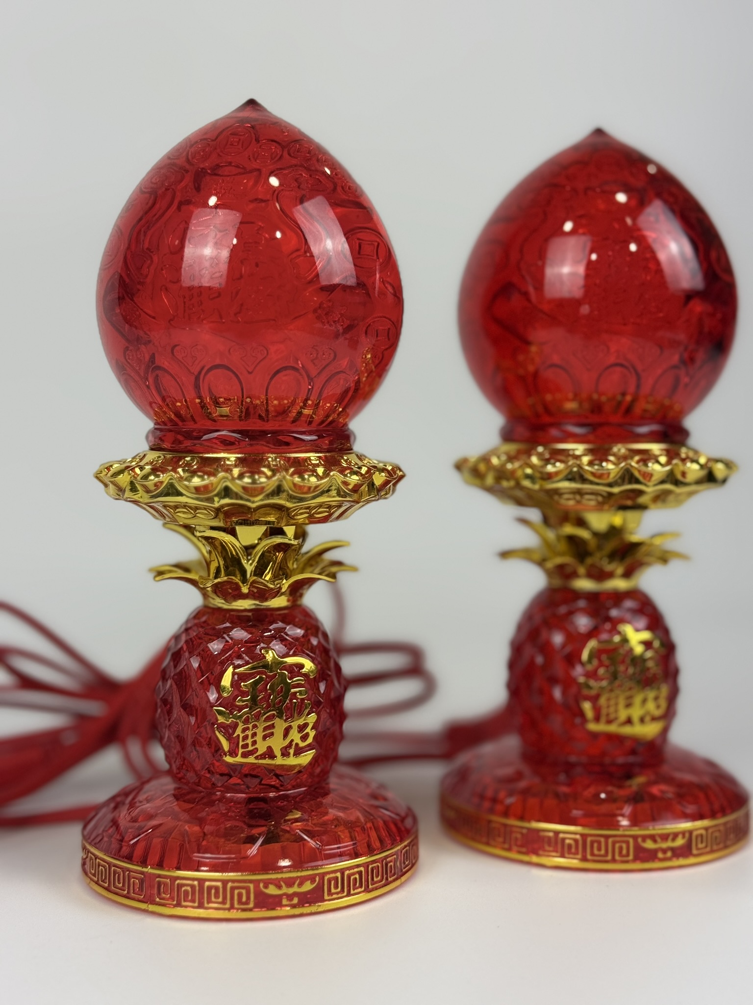 Features very intricate lighting at the top and an pineapple (HUAT AH) right in the middle and a sturdy gold base — simple, elegant, and respectful for all altar setups.
