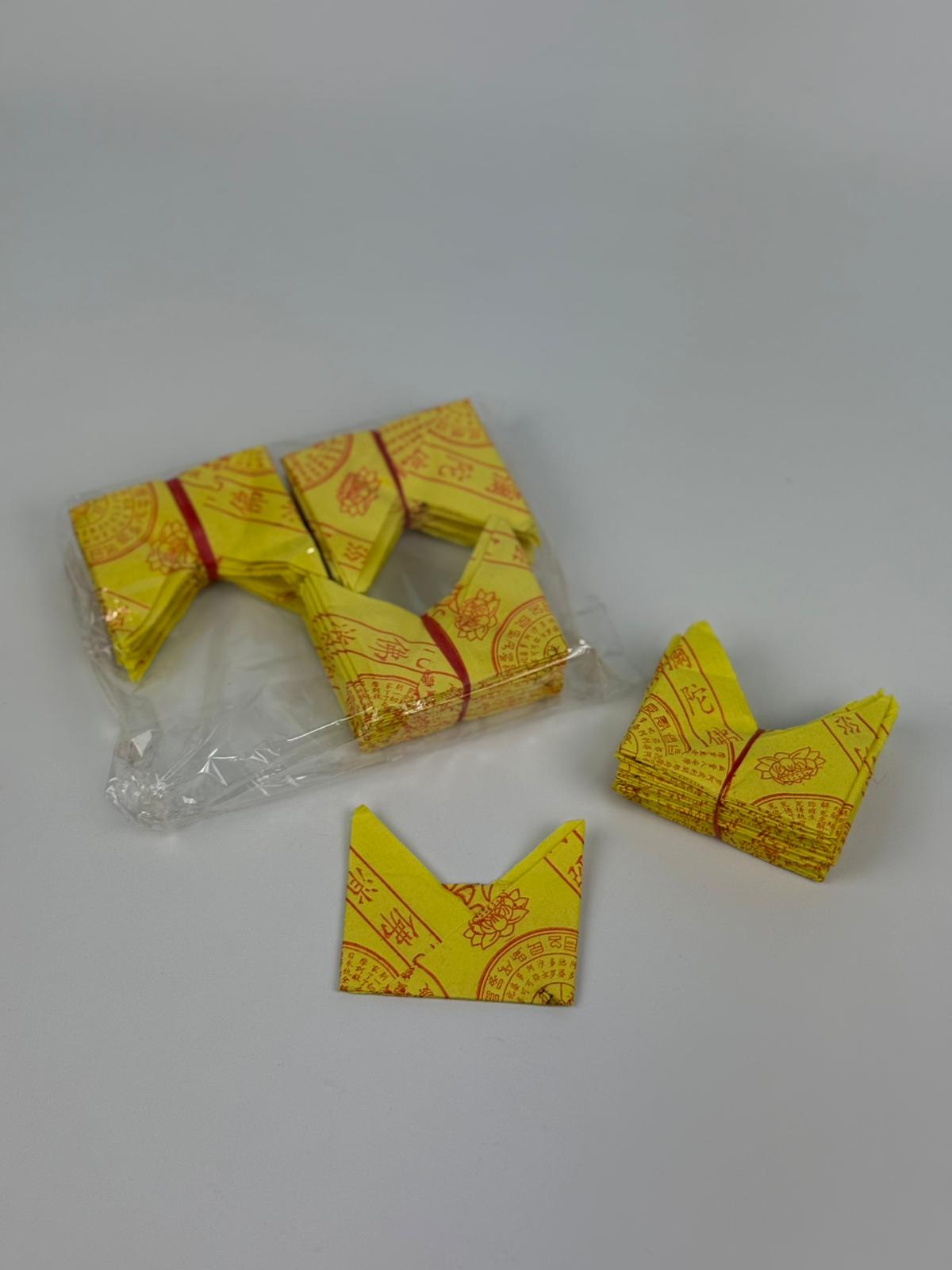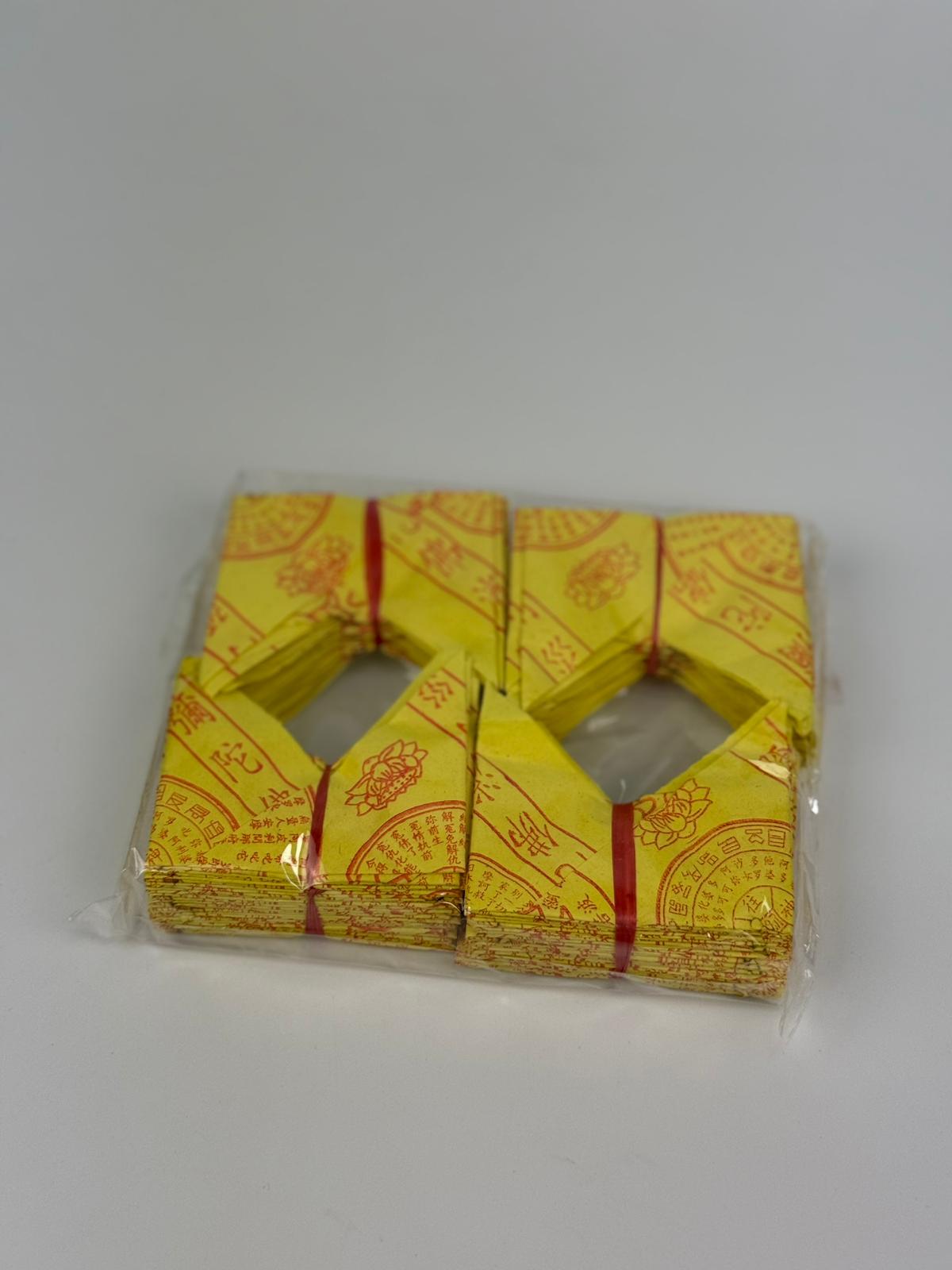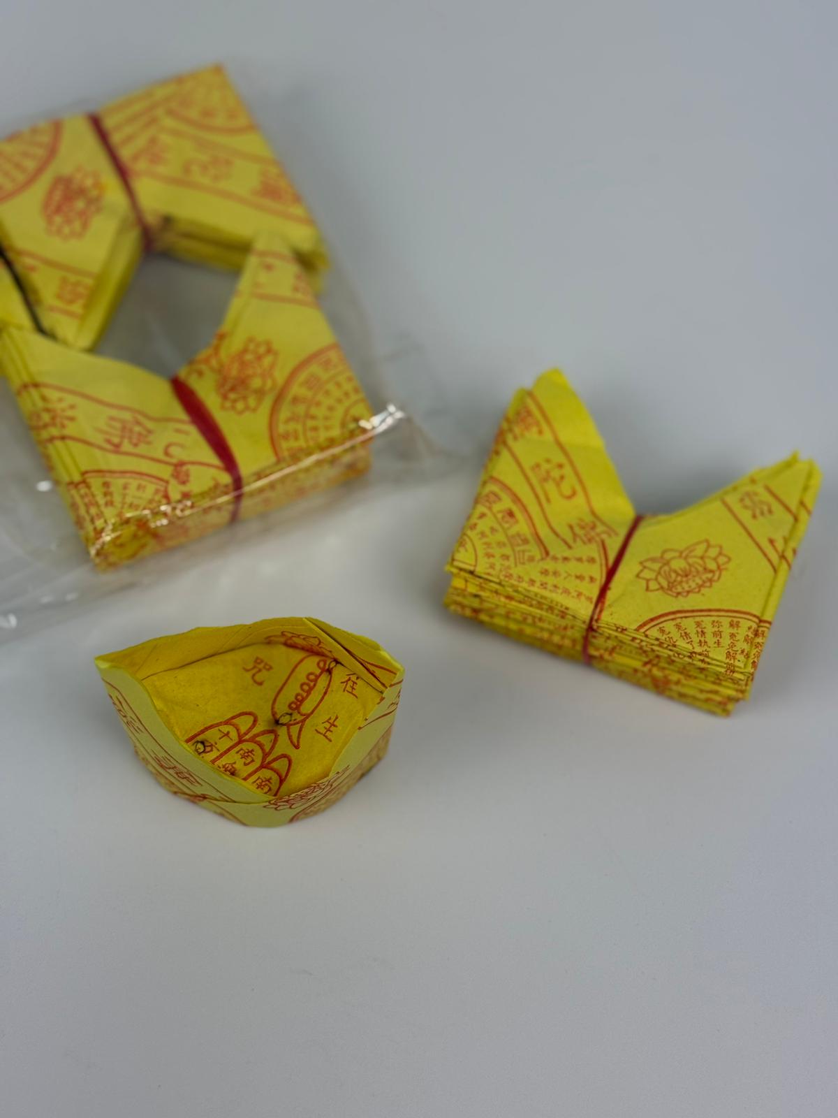 Wang Sheng Qian Yuan Bao is a traditional paper offering for the deceased, folded into the shape of a gold ingot. It symbolizes the transfer of wealth, blessings, and filial respect to ensure peace, prosperity, and comfort for the departed in the afterlife.